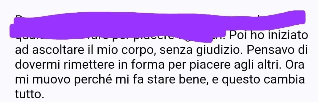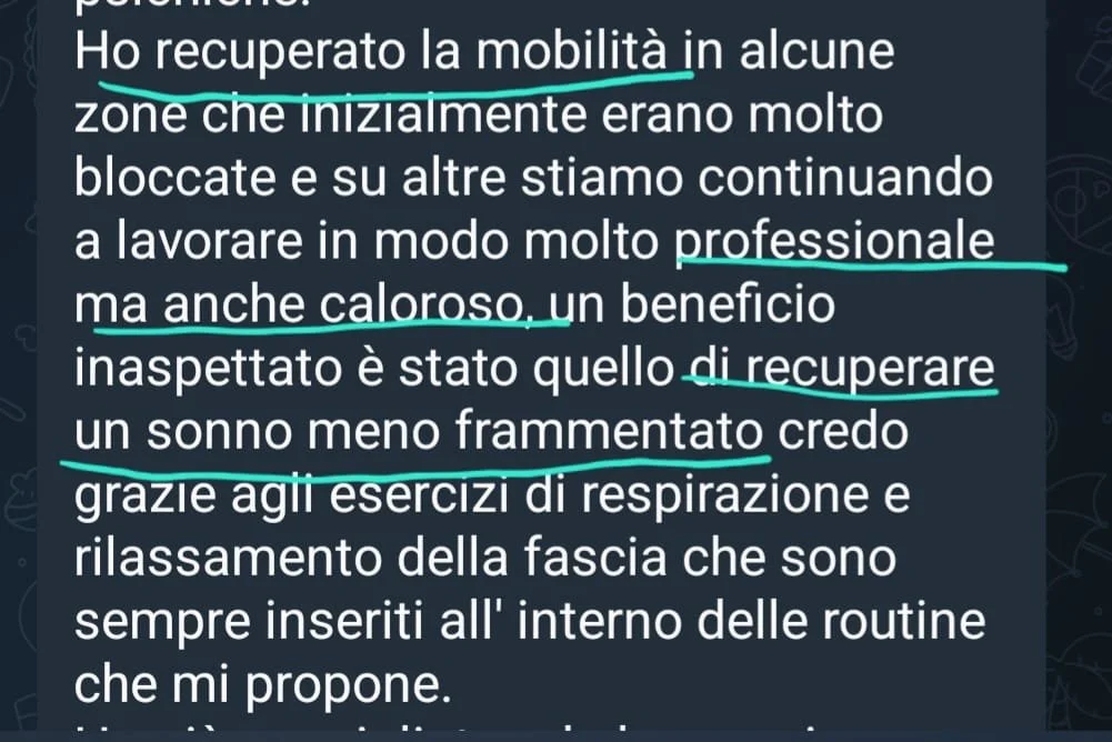 Ogni settimana riceverai una scheda di movimento con esercizi specifici per te e lezioni che selezionerò dallo studio online, per aiutarti a mantenere la costanza e muoverti un po’ ogni giorno (o quasi). Le schede sono interattive: potrai compilarle, commentarle e condividerle con me per un condividere con me per un follow-up costante.