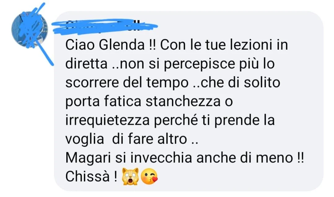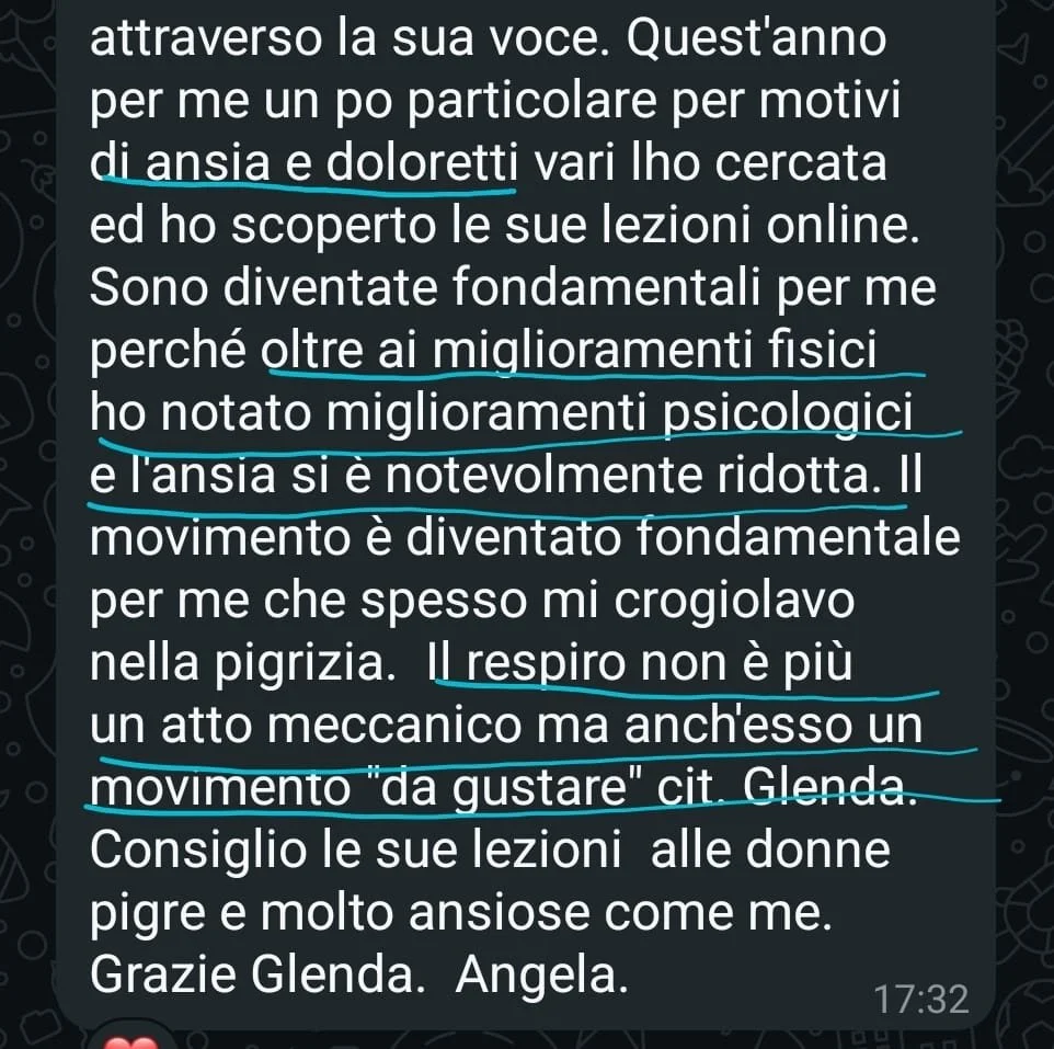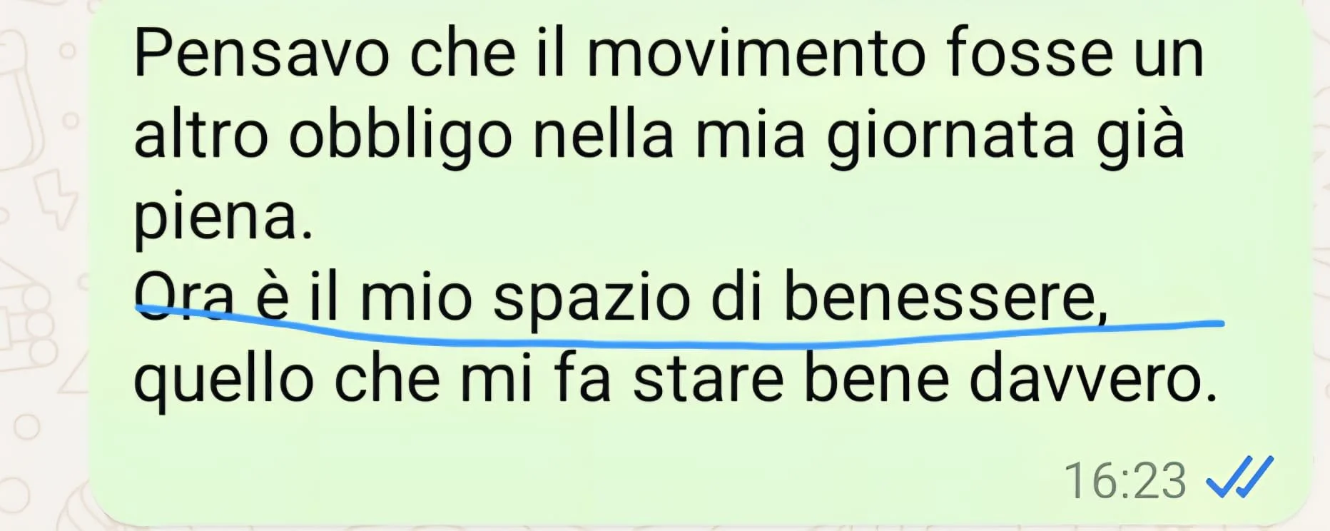 Avrai accesso diretto a me per tutto il percorso. Potrai fare domande, ricevere chiarimenti sugli esercizi, condividere dubbi o piccoli progressi: un sostegno costante che ti permette di sentirti accompagnata anche fuori dalle lezioni. La chat è il tuo spazio per prenderti cura di te, in tempo reale, con risposte e indicazioni personalizzate.